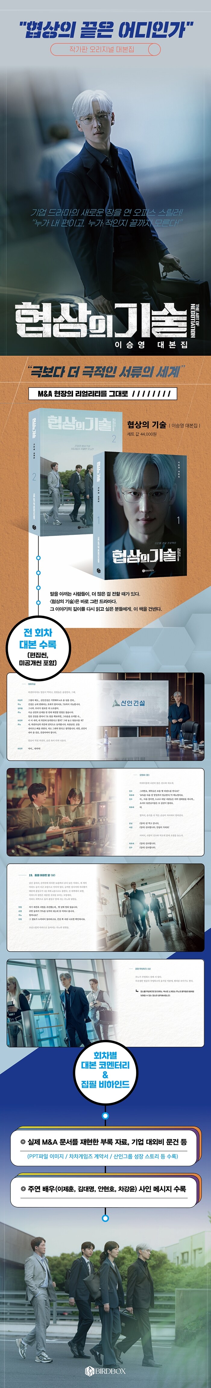 伝説の交渉家ユン・ジュノと彼のチームが企業のM&Aの過程で高度な心理戦を繰り広げ、回を重ねるごとに予測不可能な流れと逆転を生み出し、週末のお茶の間を魅了した。 毎回最高視聴率を更新し、話題を集めた『交渉の技術』が作家イ・スンヨンの初のシナリオ集として出版される。
